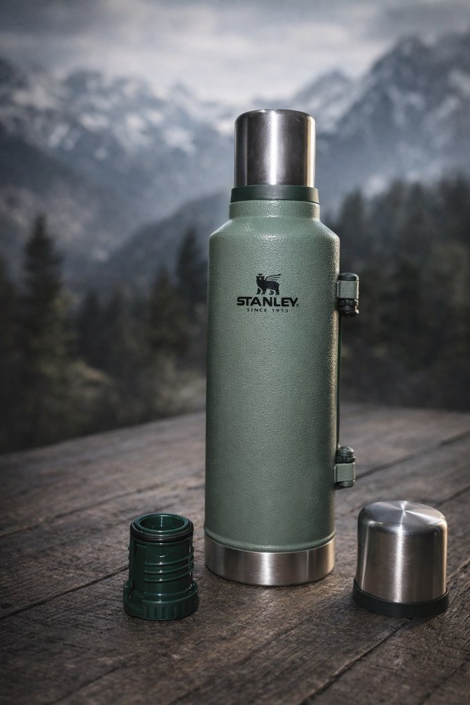 Stanley markalı khaki renkli termos, içecekleri uzun süre sıcak veya soğuk tutar. Dayanıklı yapısı ve çıkarılabilir bardağı vardır.