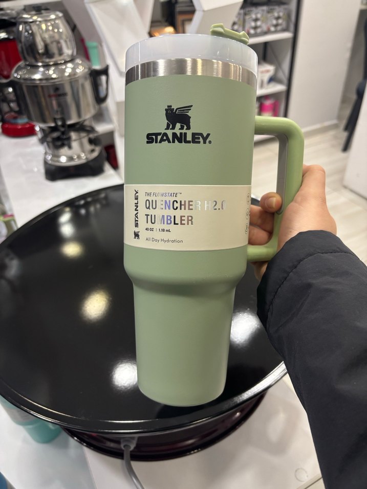 Stanley marka khaki renkli termoslu kupa, büyük kulp ve güvenli kapak ile içeceklerinizi gün boyu sıcak veya soğuk tutar. ☕