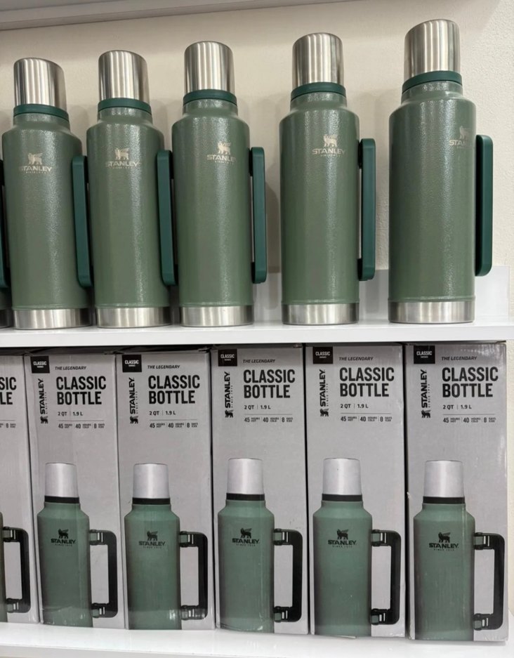 Stanley klasik termos şişeler, paslanmaz kapaklı khaki renkte, içecekleri sıcak tutar. Farklı boylarda ve sağlam saplı. ☕