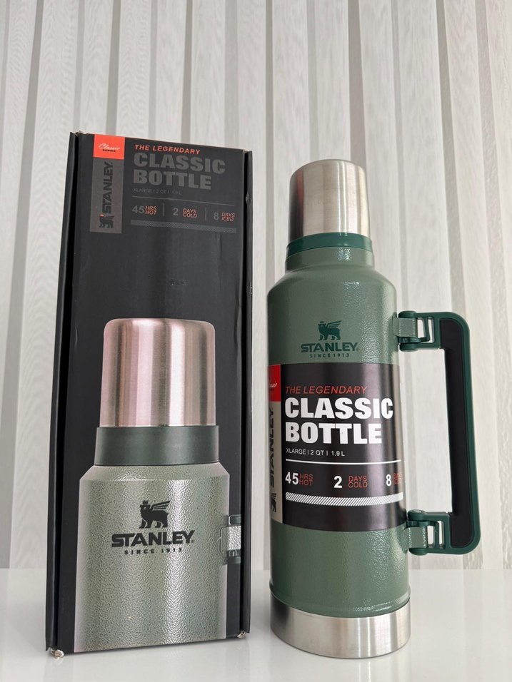 Stanley Klasik Termos Şişe, dayanıklı tasarımı ve geniş kulplu kapak ile sıvıları uzun süre sıcak veya soğuk tutar.
