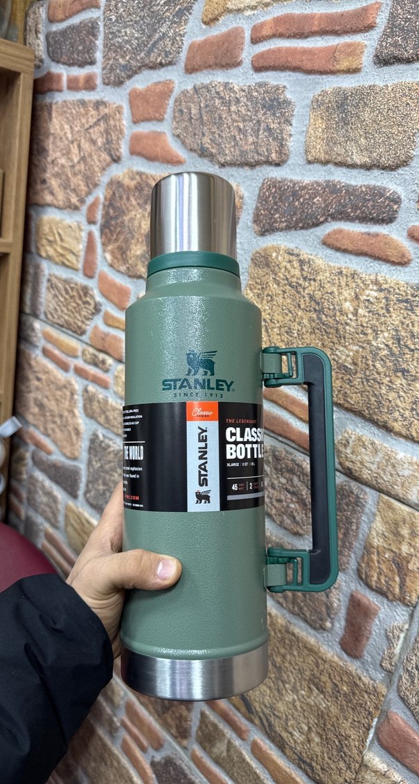 Stanley'nin haki renk klasik termos şişesi, sağlam sapı ve paslanmaz çelik kapağı ile içecekleri saatlerce sıcak tutar.
