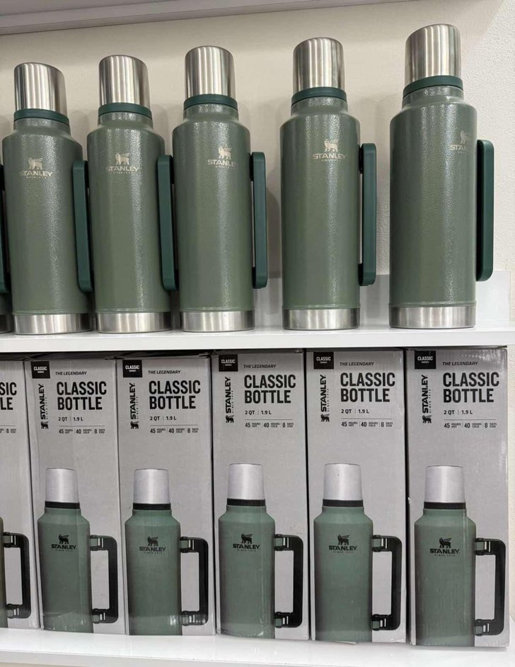 Stanley klasik termos şişe, sağlam saplı ve paslanmaz çelik kapaklı, içecekleri uzun süre sıcak veya soğuk tutar.
