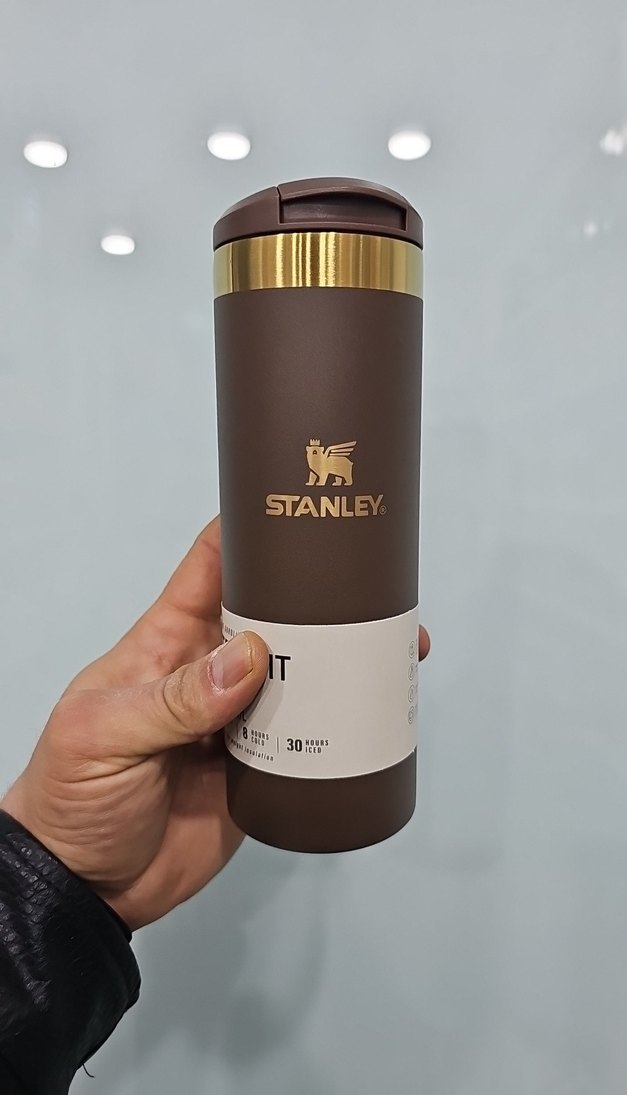 Stanley'nin koyu bej termosu, içecekleri uzun süre sıcak veya soğuk tutar. Güvenli kapağı ve 30 ons kapasitesi vardır. Çocuklar için uygundur.