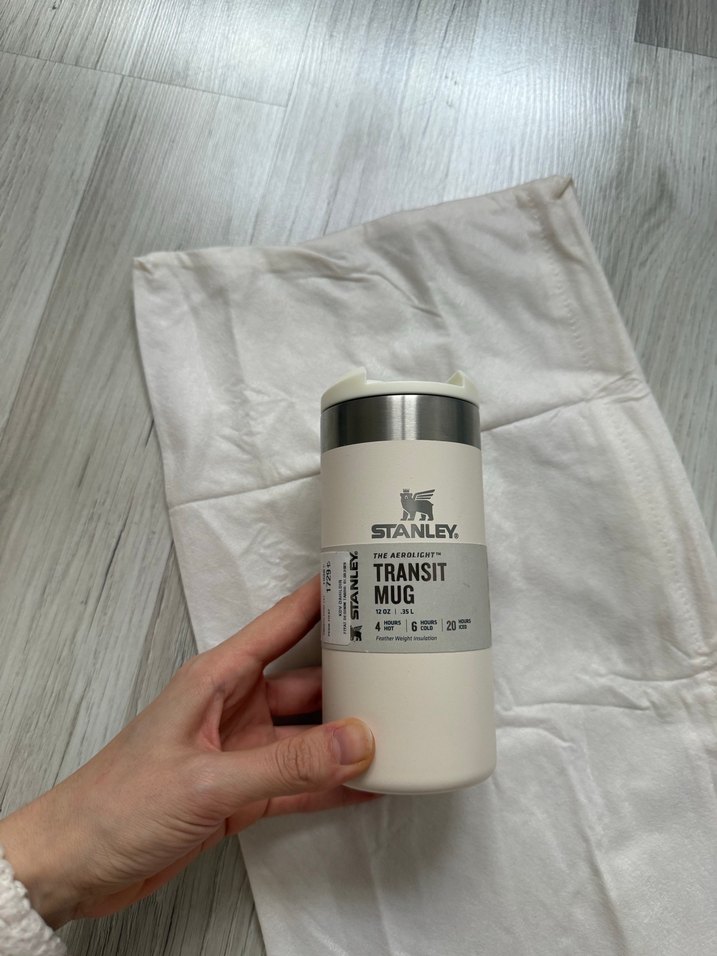 Stanley Transit Mug beyaz renkli, içecekleri saatlerce sıcak veya soğuk tutan sağlam yapıya sahip termosudur. Küçük ve taşınması kolaydır.