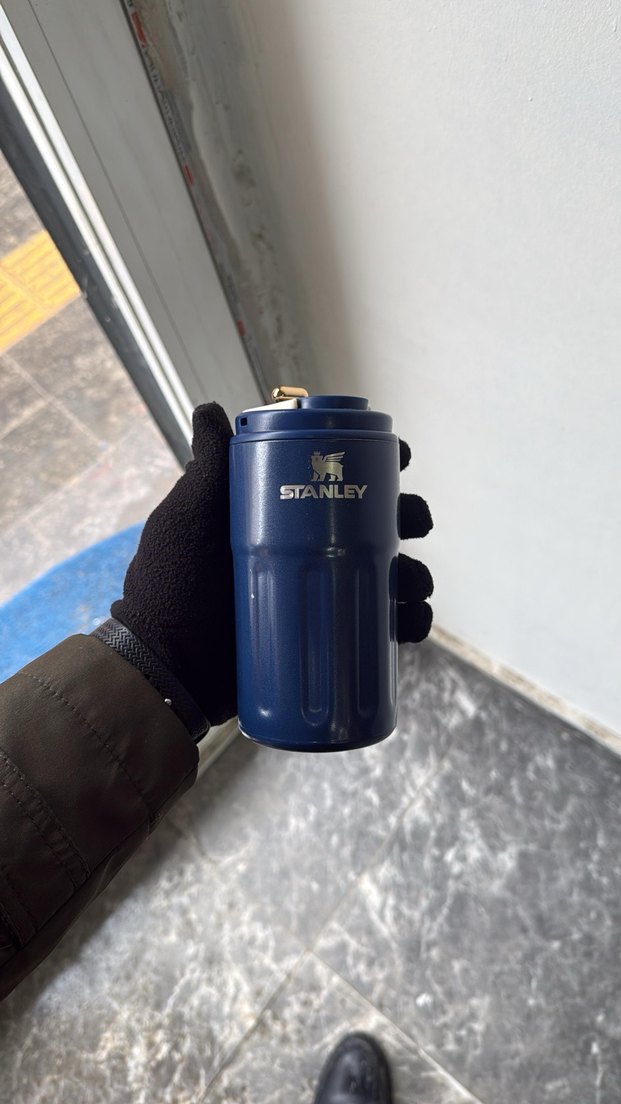 Stanley markalı lacivert çocuk termos şişesi, içecekleri sıcak veya soğuk tutar. Kompakt tasarımı ve güvenli kapağı ile taşıması kolaydır.