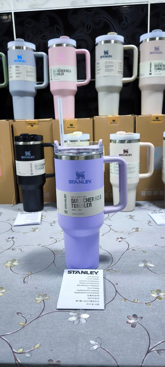 Mor pastel renkte, kulplu Stanley termos bardak. 40 oz (1 L) kapasiteye sahip, içecekleri sıcak veya soğuk tutar.