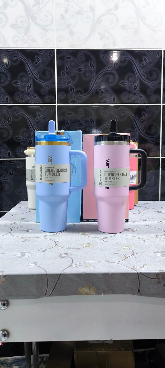 Stanley marka Pastel pembe ve mavi renklerde büyük kulplu, kapaklı termos bardaklar. Modern tasarımlı ve etiketli. ☕