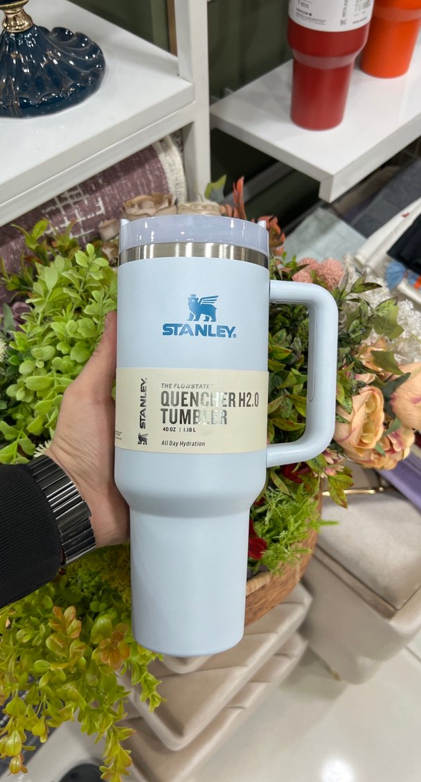 Stanley Quencher H2.0, pastel mavi renkli, kulplu ve kapaklı büyük termos bardaktır. 40 oz (1 litre) kapasiteyle gün boyu su tutar.