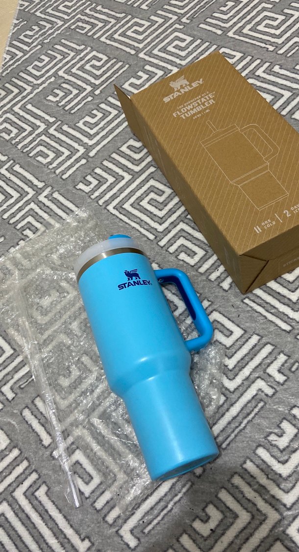 Stanley markalı, pastel mavi renkte çocuk termos bardağı. Kolay tutuş için kulplu ve içecekleri sıcak tutar.