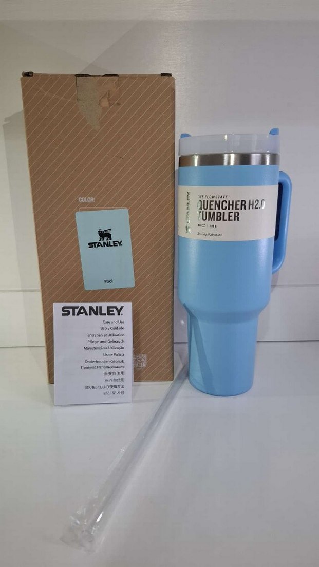 Stanley markalı açık mavi çocuk termos matara, sağlam tasarımı ve taşıma kolu ile içeceklerin sıcak veya soğuk kalmasını sağlar.
