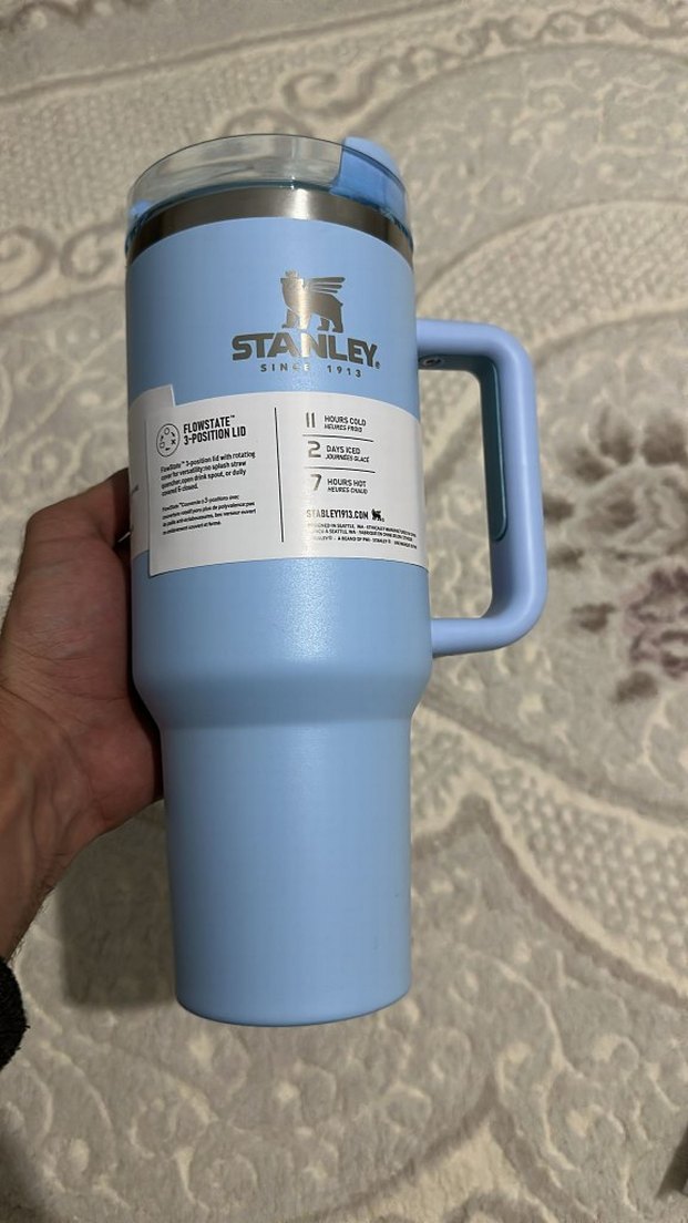 Stanley markalı pastel mavi çocuk termosu, sağlam kulplu ve şeffaf kapaklıdır. İçecekleri saatlerce sıcak veya soğuk tutar. 1.18 litre