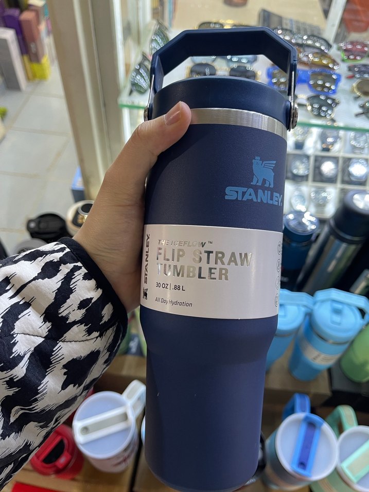 Stanley markalı mavi parlak termos şişe, kolay taşıma için kulplu ve açılır pipetli. 30 oz (0,88 L) kapasiteyle tüm gün su tutar.