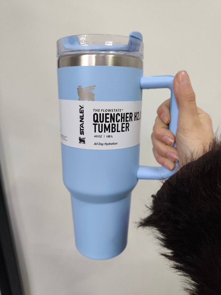 Pastel mavi renkte, saplı ve şeffaf kapaklı Stanley termos bardak. 1.18litre kapasite ile gün boyu su içmek için uygundur.