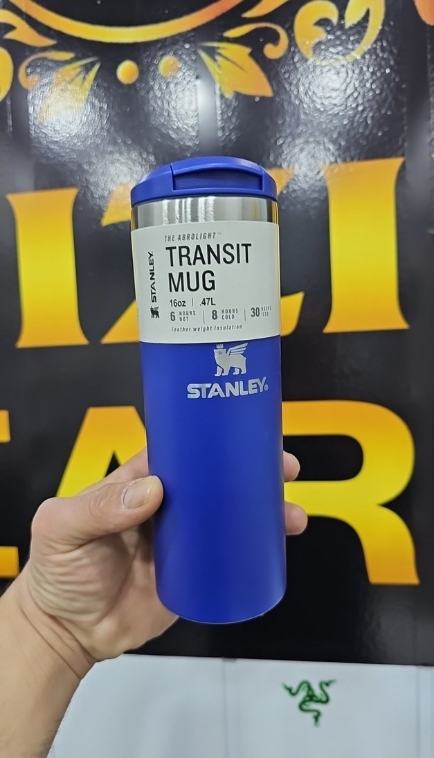 Stanley Transit Mug, 470 ml kapasiteyle içecekleri 6 saat sıcak, 8 saat soğuk ve 30 saat buzlu tutar. Canlı mavi renk ve güvenli kapak içerir.