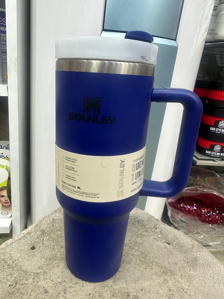 Stanley markalı koyu mavi termos kupa, sağlam kulp ve güvenli kapak ile uzun süre içeceklerin sıcak veya soğuk kalmasını sağlar.
