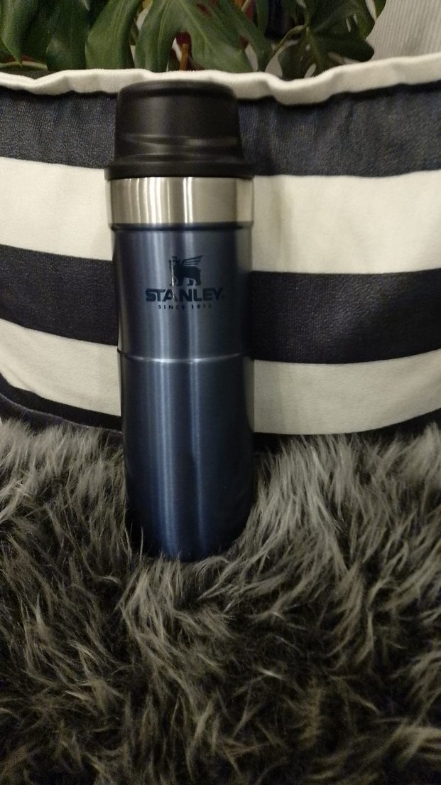Stanley markalı, mavi gövde ve gri kapaklı termos şişe, içecekleri uzun süre sıcak veya soğuk tutar.