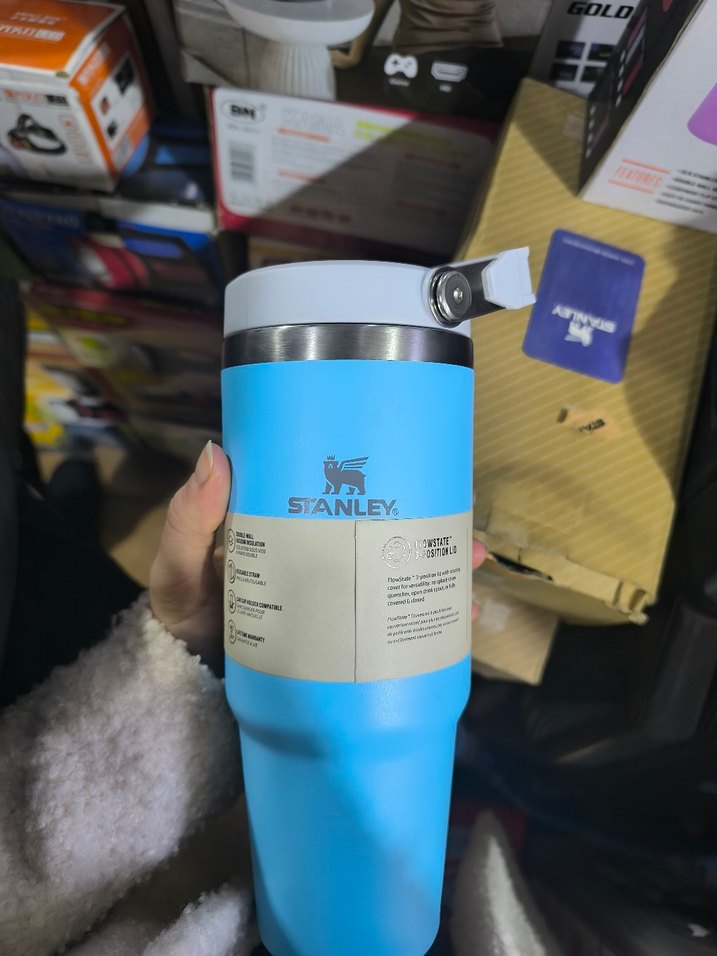 Stanley markalı, mavi renkli termos şişesi, içecekleri sıcak veya soğuk tutar. Taşıması kolay, güvenli kapaklıdır. (ithal ürün)