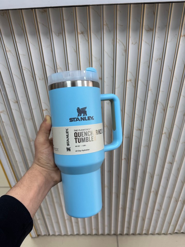 Stanley markalı mavi büyük kupa, tutma kolu ve kapaklıdır. Renkli ve dayanıklı yapısıyla içeceklerinizi uzun süre sıcak veya soğuk tutar. ☕