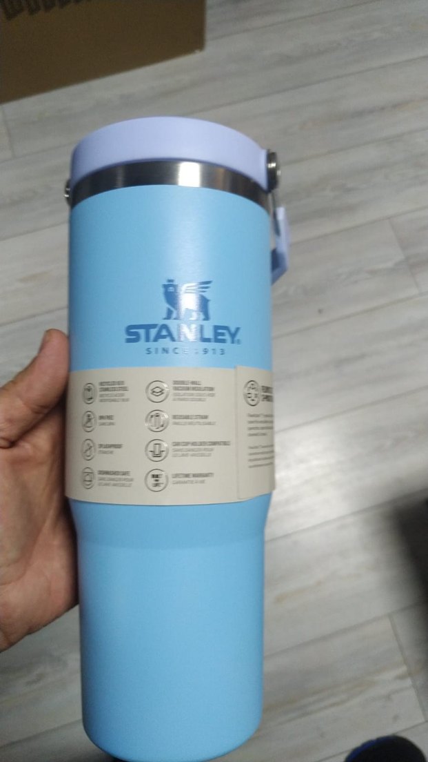 Stanley marka açık mavi termosu, içecekleri sıcak veya soğuk tutan dayanıklı yalıtımla. Güvenli kapak ve taşınması kolay tasarıma sahip.
