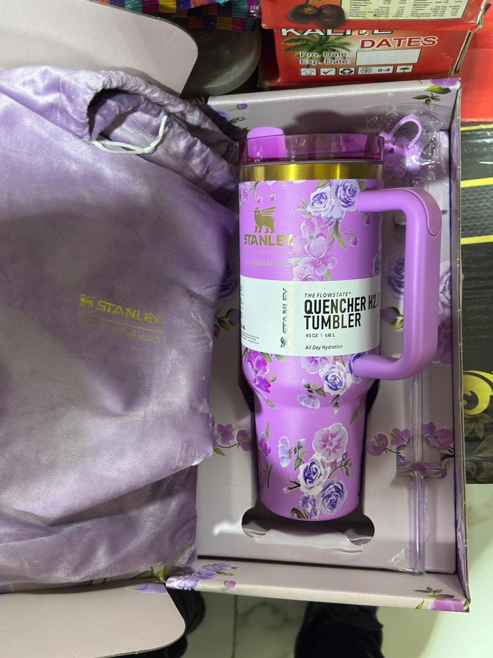 Pastel mor renkte Stanley çiçek desenli termos bardak, kulplu ve kullanımı kolaydır. Yumuşak kılıf ve pipet ile birlikte gelir. orijinal yurtdışından gelmiştir