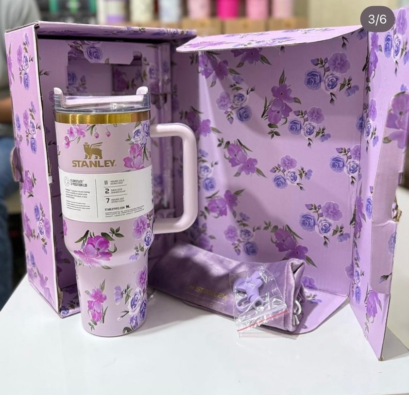 Mor renkte, pastel çiçek desenli Stanley termos bardak, taşıma kolu ve koruyucu kılıf ile birlikte gelir.