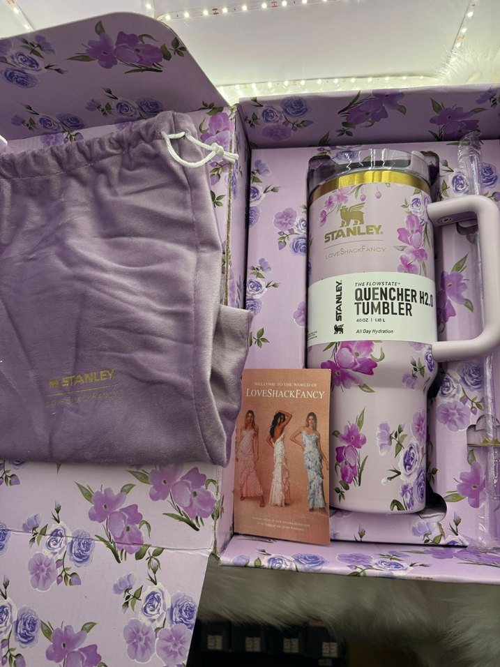 Stanley mor çiçek desenli termos matara, yumuşak çanta ve küçük kitapçık ile birlikte gelir. İçecekleri sıcak veya soğuk tutar.