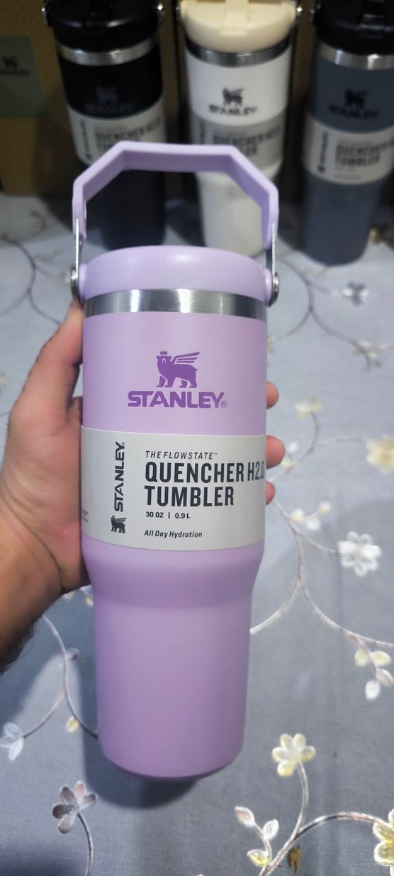 Pastel mor renkte Stanley Quencher H2O termos, 887 ml kapasiteye sahip ve gün boyu su içmeyi sağlar. Taşıma için sağlam bir tutma sapı bulunur.