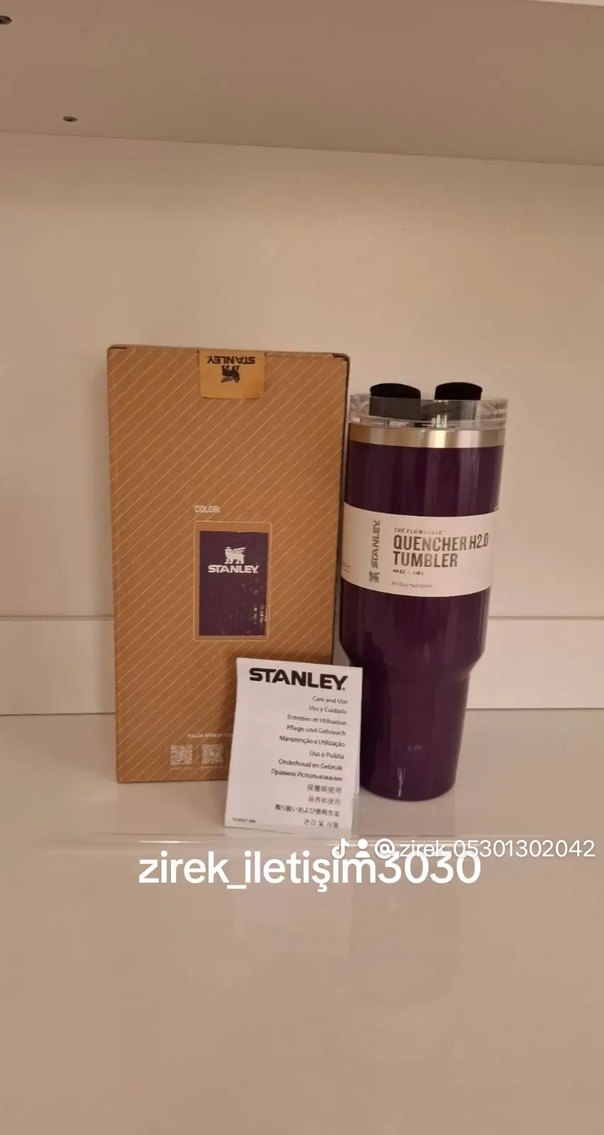 Stanley markalı mor renkli çocuk termos şişesi, dayanıklı yapısı ve güvenli kapağı ile içecekleri sıcak veya soğuk tutar. Model numarası 5301302042.