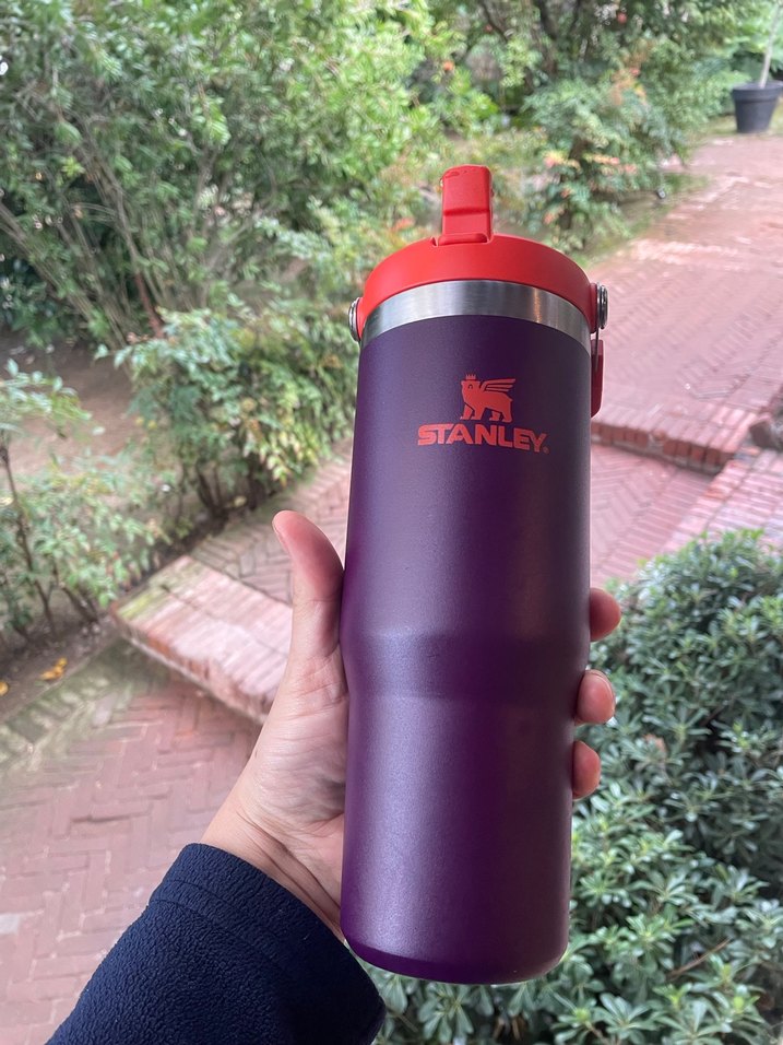 Stanley markalı koyu mor termos , içecekleri saatlerce sıcak veya soğuk tutar. Turuncu kapaklı ve dayanıklı yapıya sahiptir. Kullanılmadı.