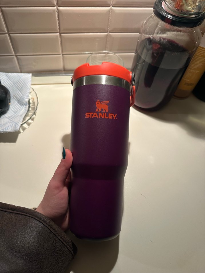 Stanley markalı, koyu mor renkte termos. Turuncu kapaklı. Dayanıklı yapıya sahiptir.
