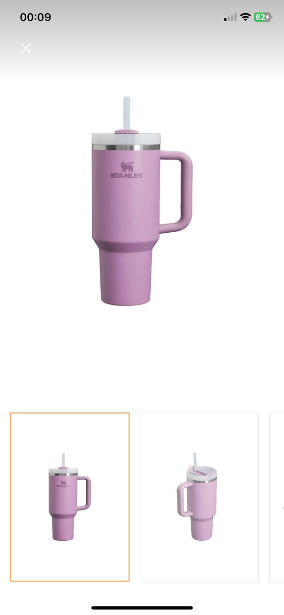 Stanley markalı mor termos bardak, pastel renkte, saplı ve pipetli kapaklıdır. İçeceklerin sıcaklığını korur ve kolay kullanım sağlar.