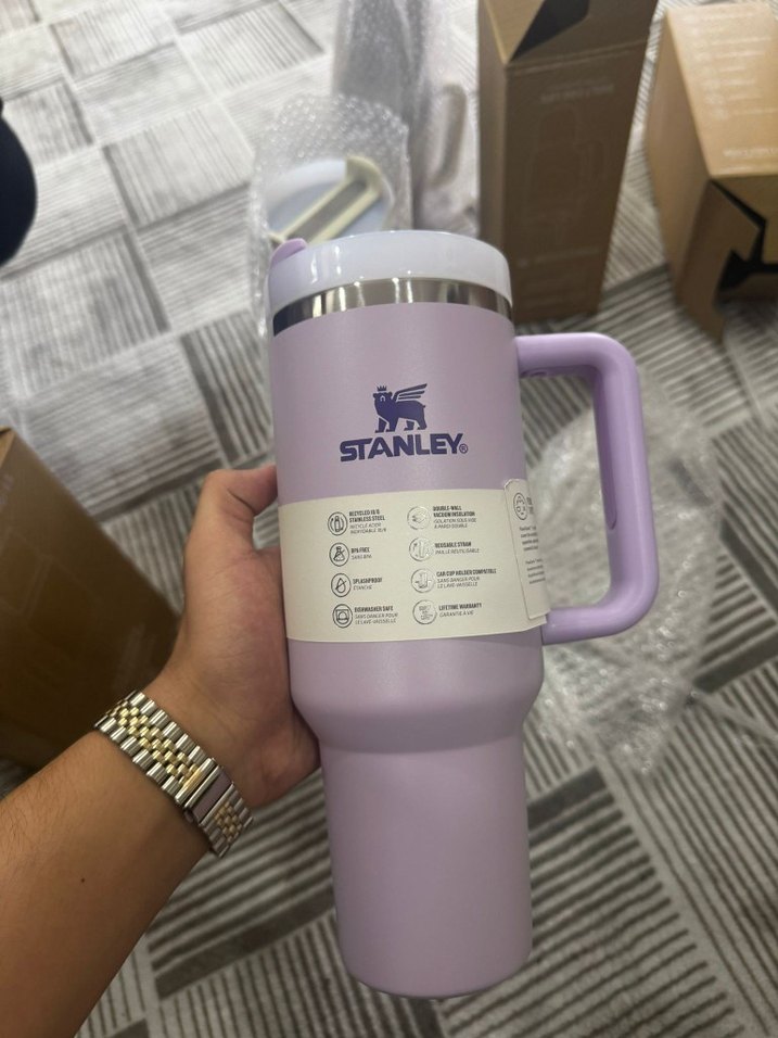 Pastel mor renkte Stanley termos bardak, sağlam sap ve dayanıklı yapıya sahip, içecekleri sıcak veya soğuk tutar.