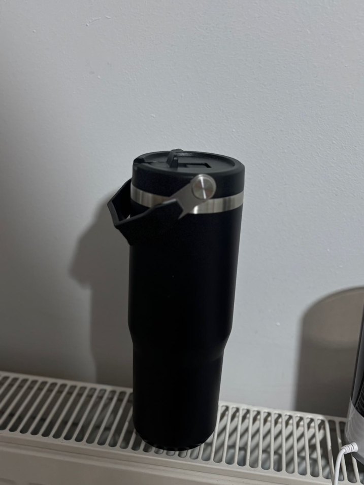 Siyah termos su ısıtıcı, güvenli kapak ve kolay dökme için kulpla tasarlanmıştır. Sıvıları sıcak tutar.
