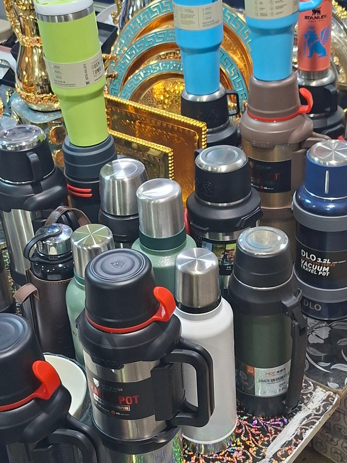 Çeşitli tasarımlı, saplı renkli çocuk termos şişeleri. İçecekleri sıcak veya soğuk tutmaya uygundur. Farklı boy ve canlı renklere sahiptir.