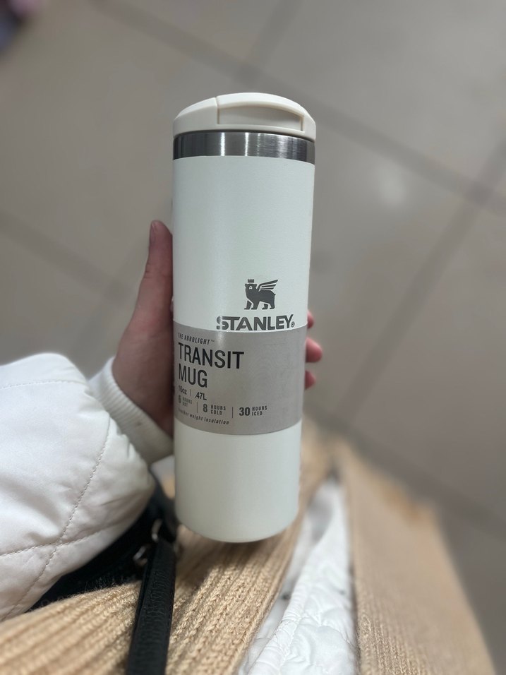 Stanley marka beyaz Transit termos kupa, 830 ml kapasite ile içeceklerinizi uzun süre sıcak veya soğuk tutar. Hafif ve dayanıklı yapıda. ☕ Renkleri mevcuttur