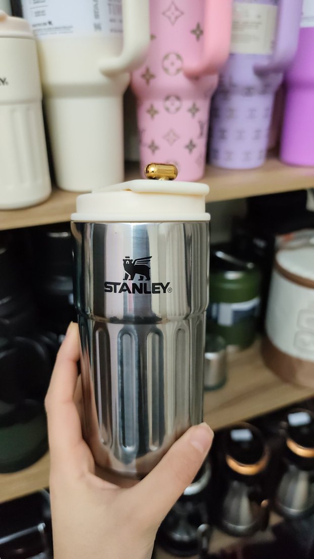 Stanley termos şişe parlak gümüş gövde, beyaz kapak ve altın renkli düğme içerir. İçecekleri uzun süre sıcak veya soğuk tutar.