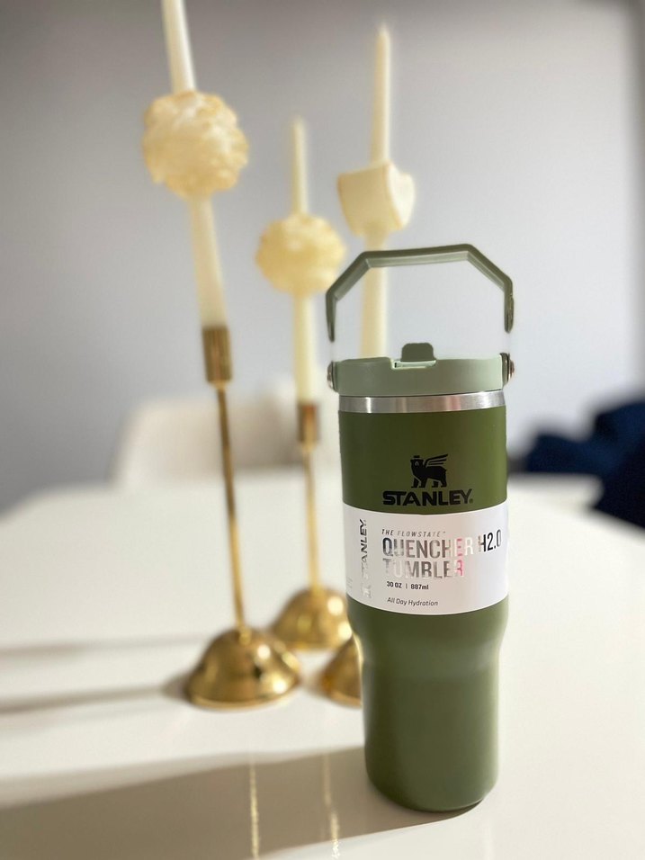 Parlak haki renkte, Stanley markalı çocuk termosu, sağlam saplı ve içecekleri sıcak veya soğuk tutar.