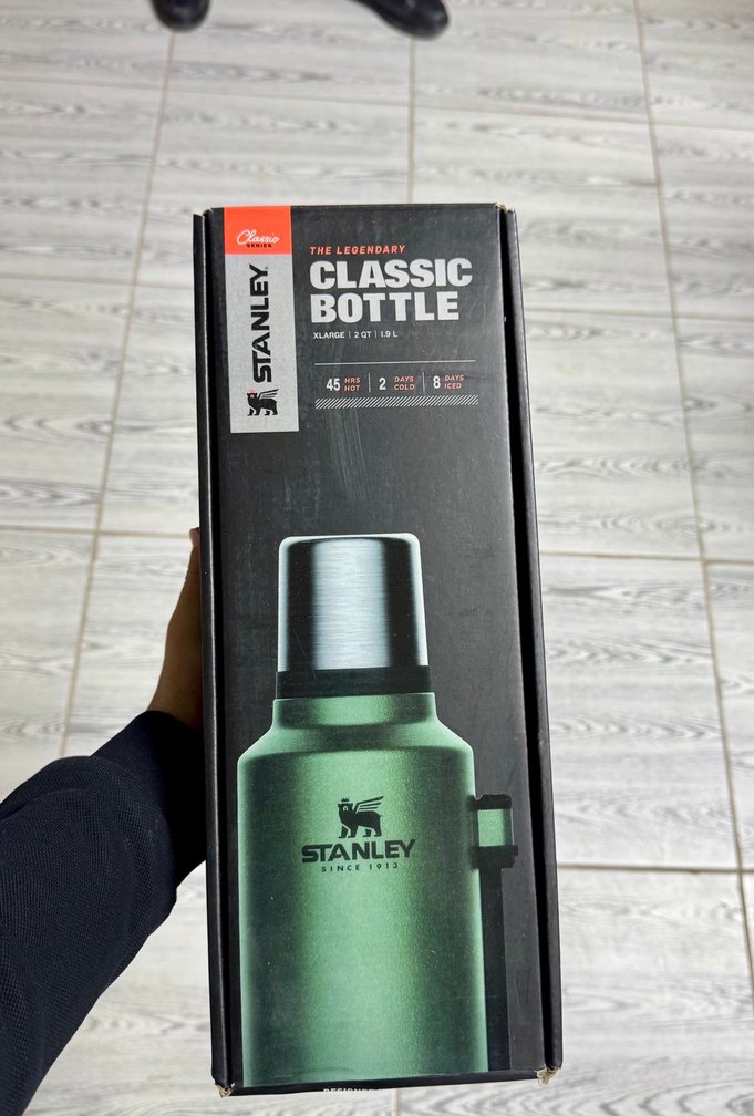 Stanley parlak haki klasik termos şişe, 1.9 litre kapasite ve dayanıklı yapıya sahiptir, içecekleri sıcak veya soğuk tutar.