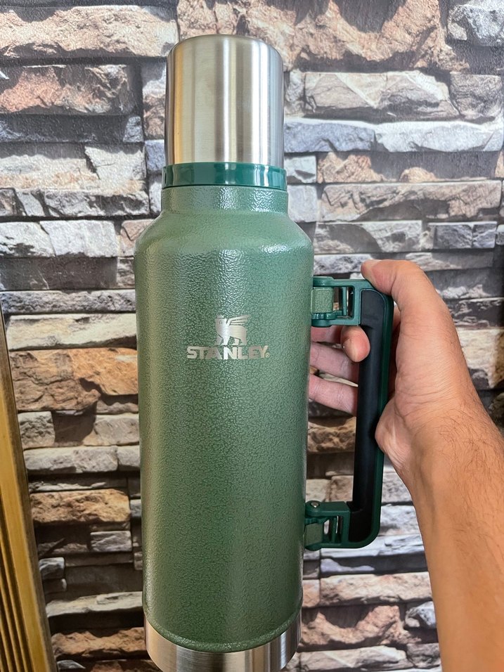 Parlak haki renkte Stanley termos, sağlam tutacak ve paslanmaz çelik kapak ile içecekleri sıcak veya soğuk tutar.