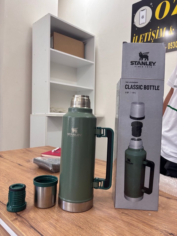 Stanley parlak haki renkte klasik termos şişe, sağlam saplı ve paslanmaz çelik bardaklı. İçecekleri saatlerce sıcak veya soğuk tutar.