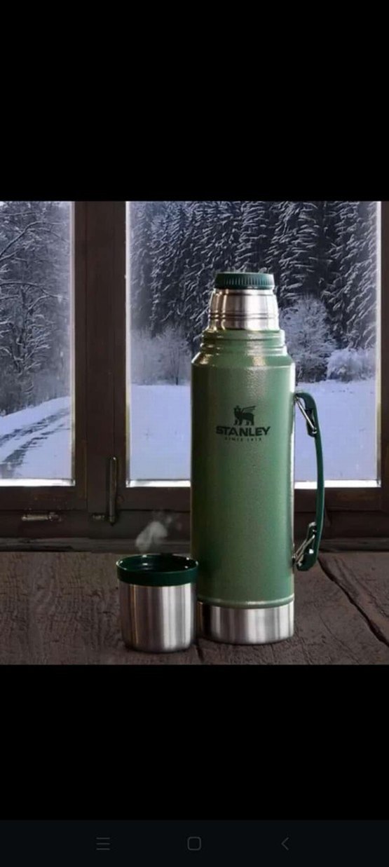 Stanley termos şişe, parlak haki renkte, sağlam saplı ve çıkarılabilir bardaklıdır, içecekleri sıcak tutar.