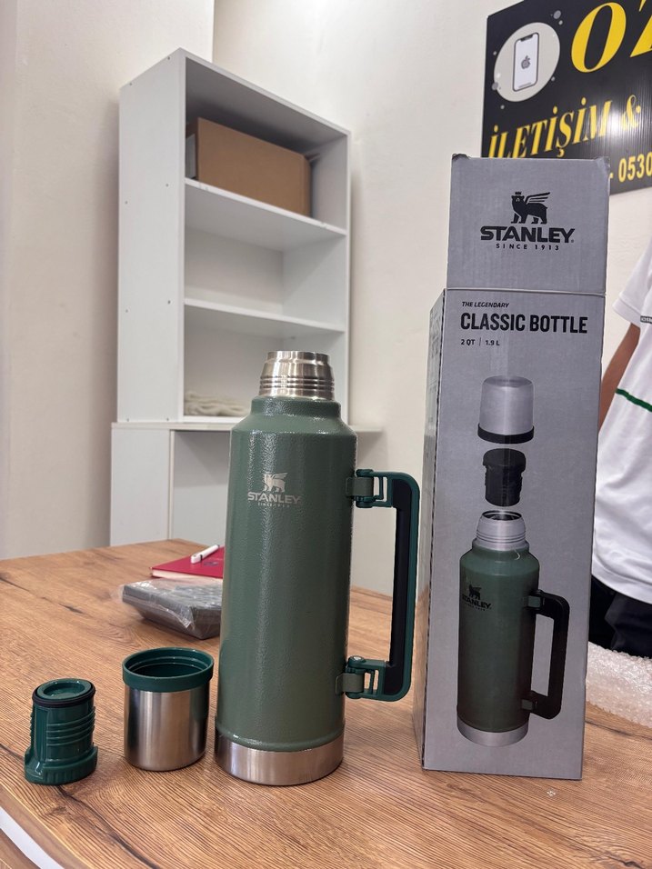 Stanley Classic Bottle parlak haki renkte, dayanıklı saplı ve çıkarılabilir parçalarla kolay temizlenir. İçecekleri sıcak veya soğuk tutar.