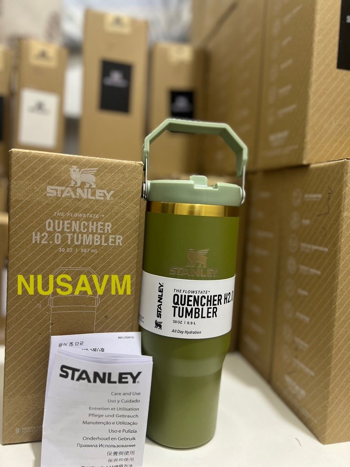 Parlak haki renkte Stanley termosu, kolay taşınabilir saplıdır ve gün boyu su içmek için uygundur. Kullanım kılavuzu dahildir.