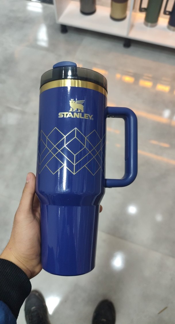 Stanley markalı parlak mavi termos bardak, sağlam kulplu ve altın renkli geometrik desenlidir. İçecekleri sıcak tutar ve taşıması kolaydır. ☕