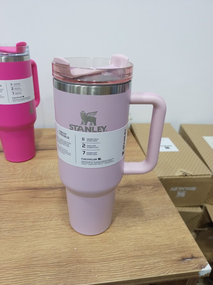 Stanley markalı pastel pembe termos bardak, geniş sapı ve güvenli kapağı ile içeceklerinizi saatlerce sıcak tutar. Yumuşak renk tonuyla kullanışlıdır. ☕