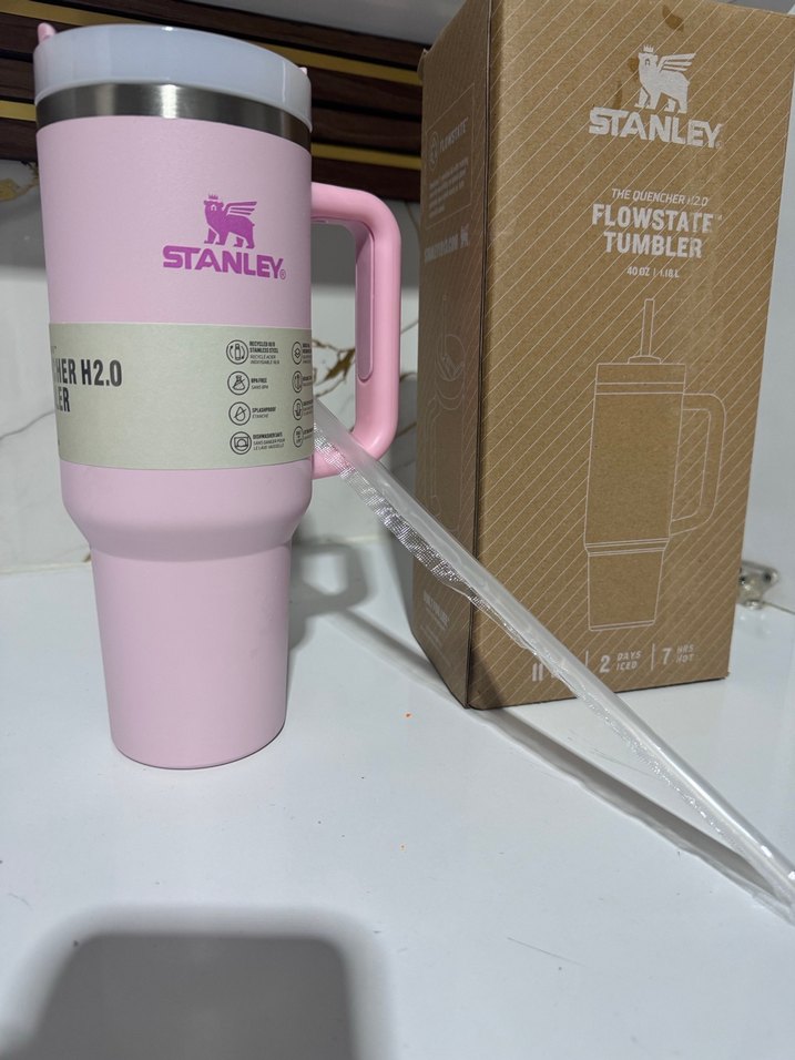 Stanley pastel pembe termos bardak, sağlam kulplu ve pipetli, içecekleri uzun süre sıcak veya soğuk tutar. Kutusunda teslim edilir.