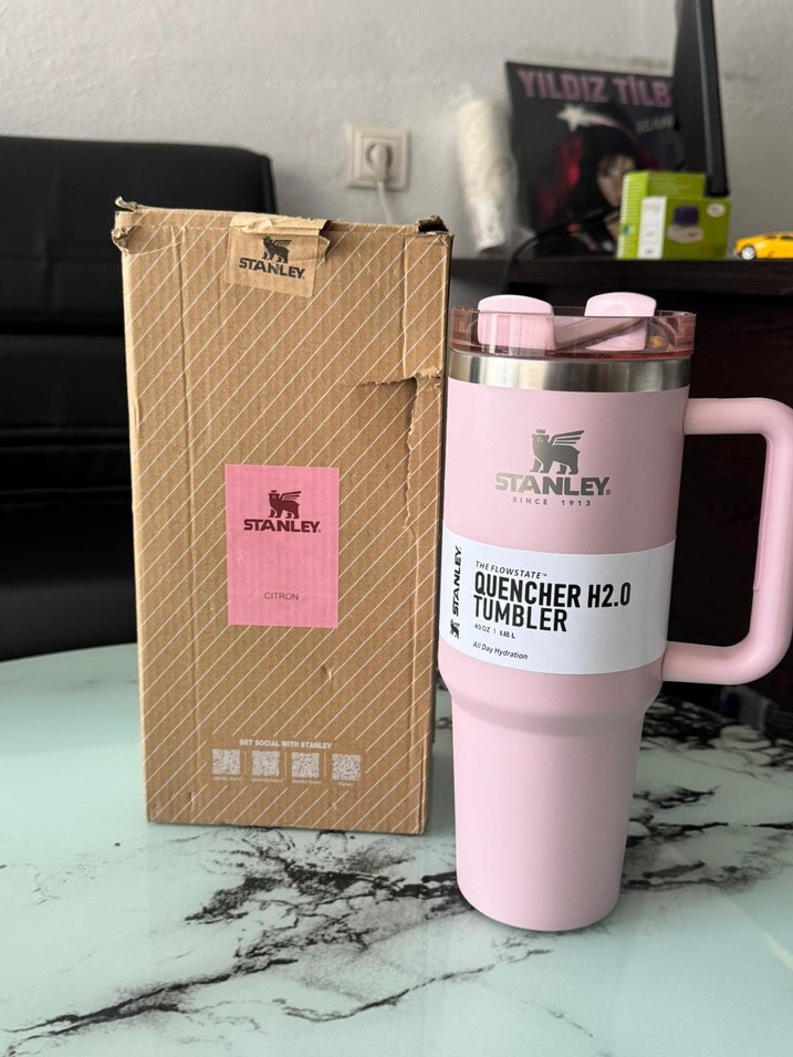 Stanley markalı pastel pembe termos bardak, sağlam sapı ve güvenli kapağıyla içecekleri sıcak veya soğuk tutar. Çocuklar için uygundur.