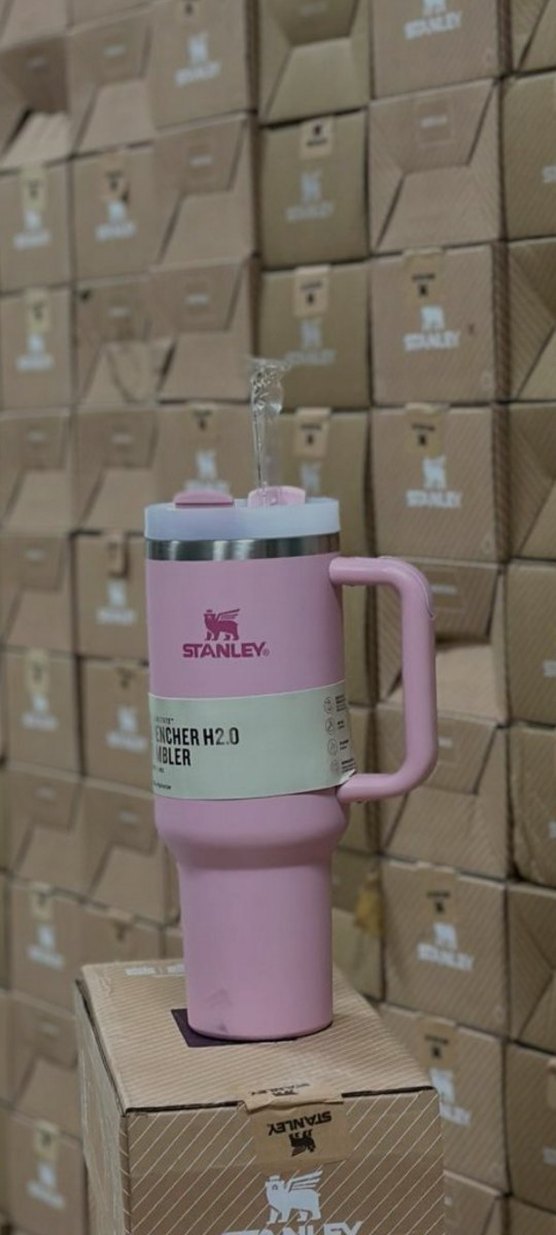 Stanley markalı pastel pembe termos kupa, dayanıklı sapı ve güvenli kapağı ile içeceklerinizi sıcak veya soğuk tutar. ☕️