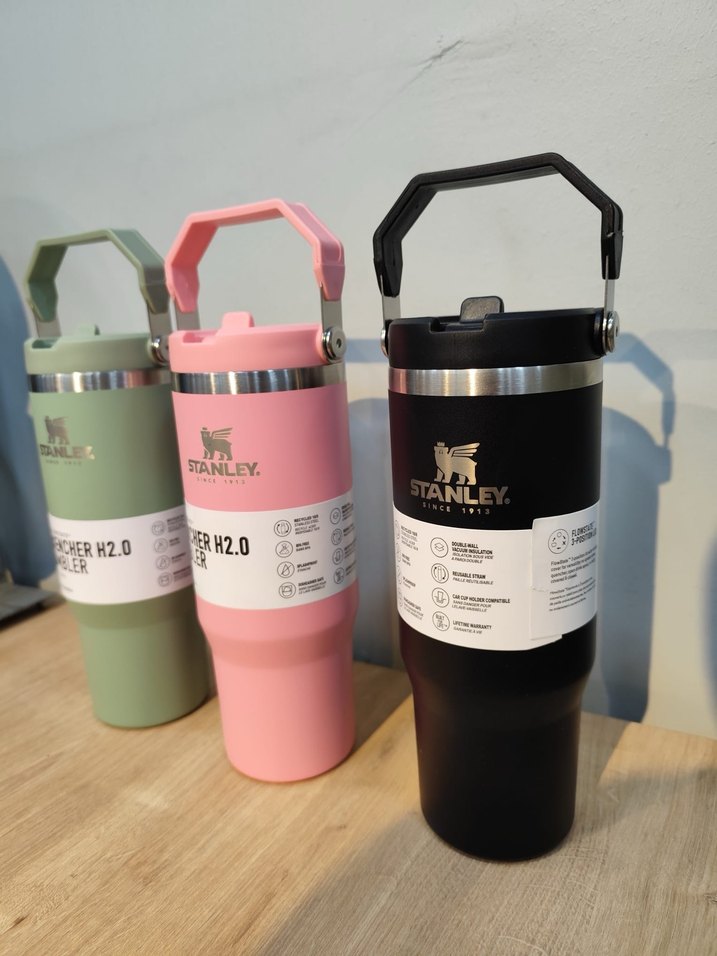 Stanley pastel pembe renkli termos matara, taşıma kolaylığı sağlayan kulp ile. Uzun süre sıcak veya soğuk tutar, dayanıklı paslanmaz çelikten üretilmiştir.