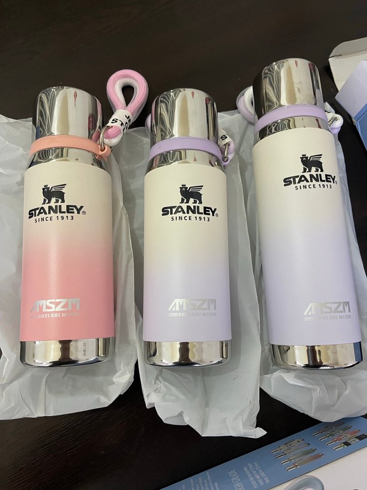 Stanley pastel renklerde, paslanmaz çelik kapaklı ve taşıma askılı çocuk termos şişeleri. İçecekleri sıcak veya soğuk tutar.